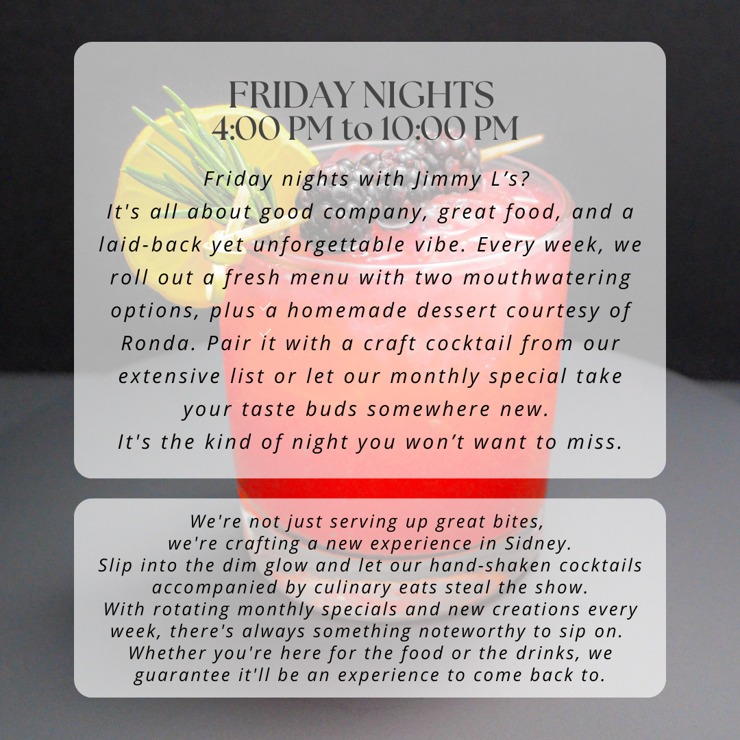 Join us for 18 weeks of exceptional dining, starting the first week of January through the first week of May. Enjoy expertly crafted cocktails, unique dishes, and unforgettable experiences. Indulge in intimate Friday nights with rotating menus and specialty cocktails, every visit promises something new and exciting within The Sit Down by Jimmy L’s.